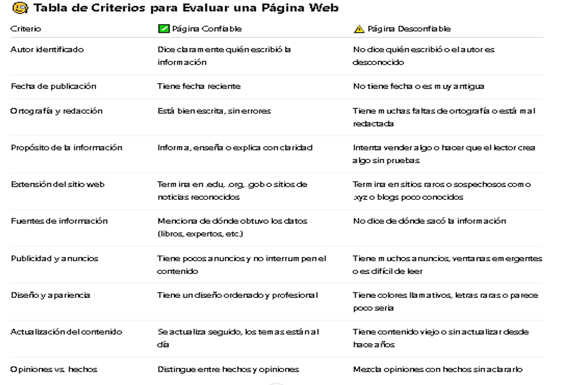 Esta tabla te ayudará a identificar si una página de internet es confiable o no. Compárala con las páginas que visitas cuando haces una investigación. ¡Recuerda que no todo lo que está en internet es cierto!